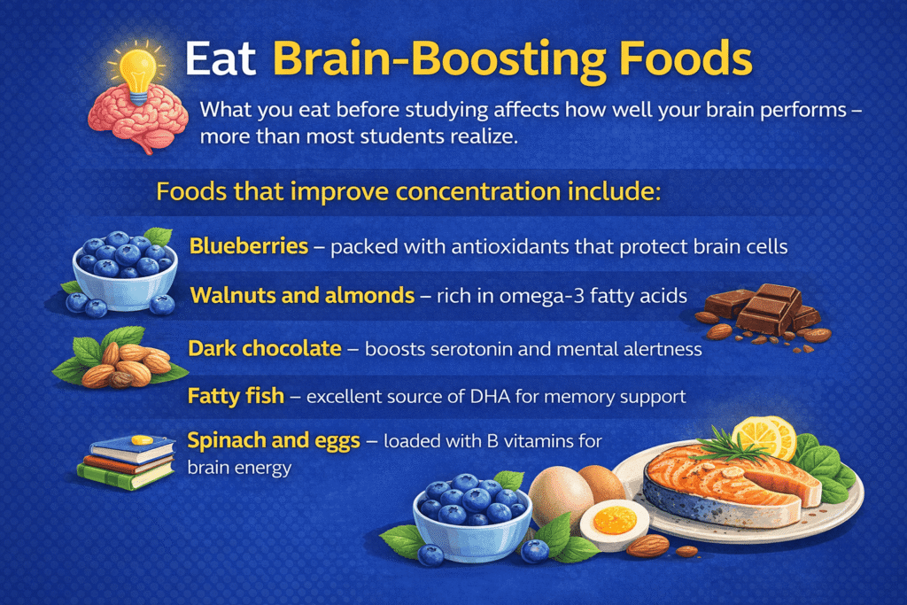 Eat walnuts, blueberries, eggs, dark chocolate, and fatty fish before studying. These foods fuel brain cell activity and support memory retention. Avoid sugary snacks — they cause energy crashes within 30 minutes.